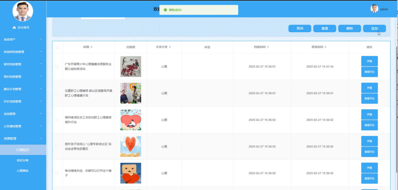 管理员可以查看心理知识详情和用户评论,通过输入标题、标签、选择分类进行搜索,进行增删改查操作,保证知识内容的全面性和实用性。界面图如下。
