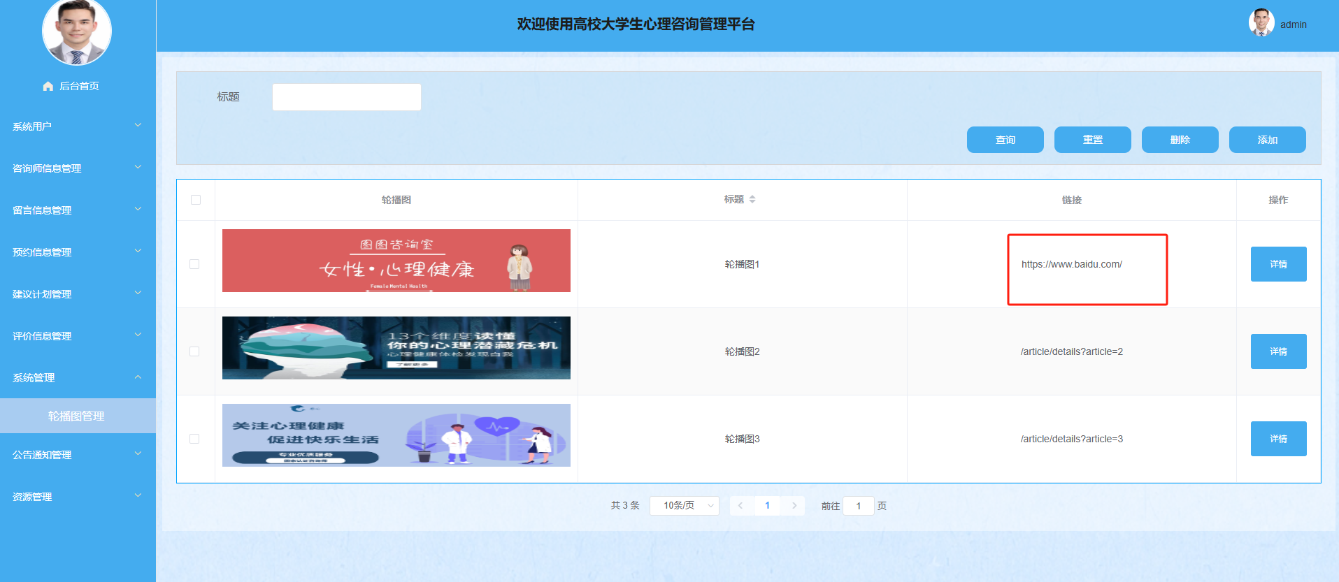 管理员可以查看轮播图信息详情,通过输入标题进行搜索,对页面进行增删改查操作,点击上传轮播图,输入标题和链接添加需要跳转的网址进行提交新增轮播图。界面图如下。