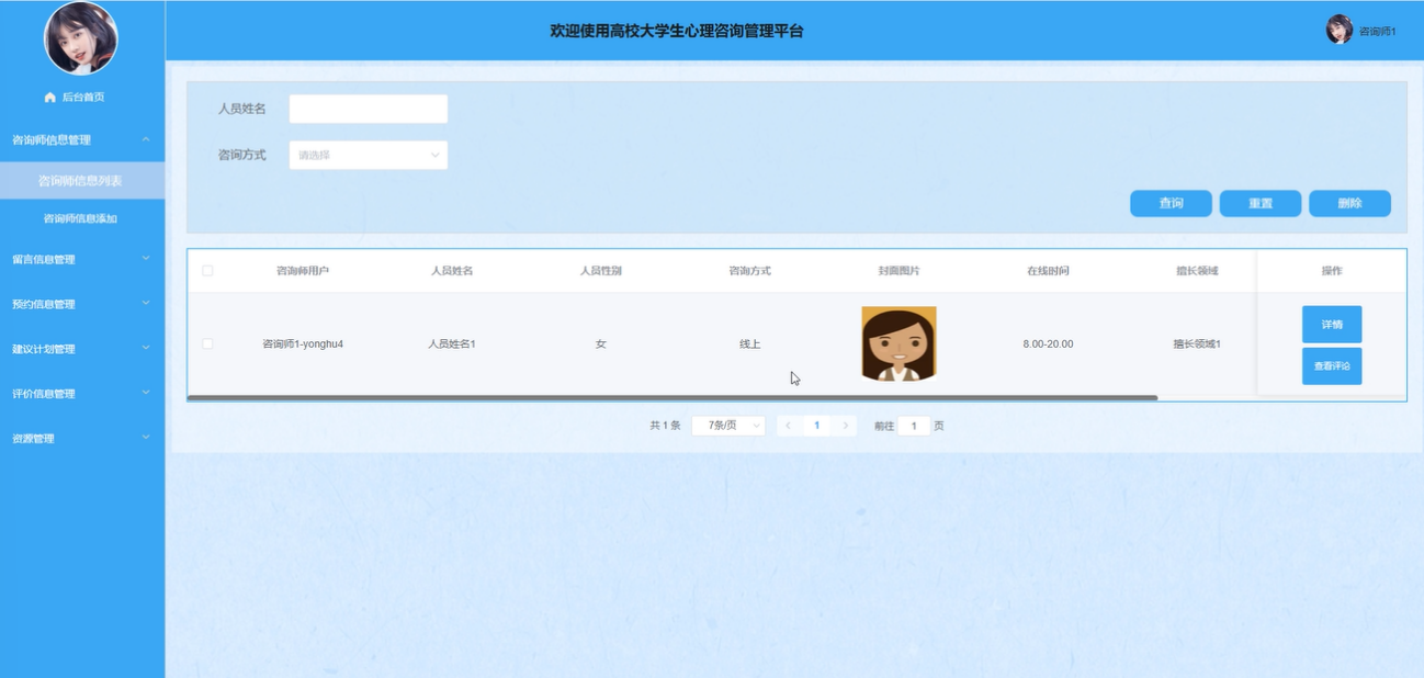 列表:咨询师可以查看自己的详细信息列表,通过输入人员姓名、选择咨询方式等条件进行搜索、查询、重置和删除操作。