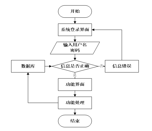 用户打开并进入系统后,会先显示登录界面,输入正确的用户名和密码,系统自动检测信息,若信息无误,则用户会进入系统功能界面,进行操作,否则会提示错误无法登录,操作流程如图2.3所示。