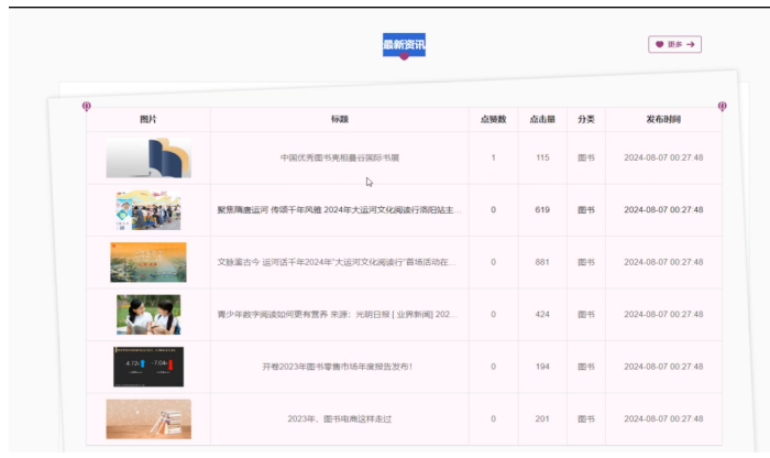 - 最新资讯:在最新资讯模块中,用户可以浏览最新的资讯、书评和推荐书单,同时可以对感兴趣的内容进行点赞、收藏和评论,增强用户参与度和互动性。