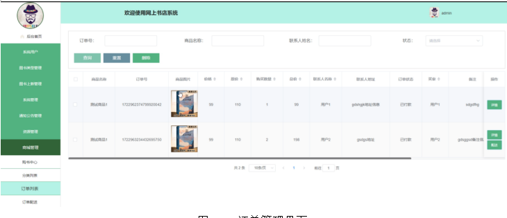 管理员登录系统后,点击"订单列表"可以查看到所有用户购买的图书订单。管理员可以对这些订单进行管理,包括确认订单、发货处理、退款处理等操作。管理员还可以查看订单详细信息,以便提供客户服务和解决订单相关问题。图书订单流程图如下图所示。