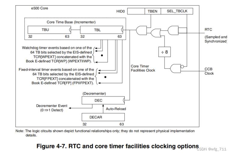 | 5、真实时间时钟 Real time clock RTC 如图所示,实时时钟(RTC)输入可选地用于时钟e500核心计时器设施。RTC也可由芯片可编程中断控制器(PIC)全局定时器设备使用。RTC独立于e500核心时钟,旨在支持相对低频率的定时应用。RTC频率范围在设备硬件规范中规定,但最大值不应超过CCB频率的四分之一。在被分配到核心时基之前,RTC被采样并与CCB时钟同步。 核心时基的时钟源由HID0中的两个字段指定:时基启用(TBEN),并选择时基时钟(SEL_TBCLK)。如果启用了时间基(设置HID0[TBEN]),时钟源确定如下:HID0[SEL_TBCLK]=0,时间基每8更新CCB时钟HID0[SEL_TBCLK]=1,时间基更新在RTC的上升边缘时间基的默认来源是CCB时钟除以8。有关更多详细信息,请参阅PowerPCe500核心复杂参考手册。计时器控制寄存器组n(PIC_TCRn)提供了关于使用RTC信号来计时PIC单元中的全局计时器的附加信息。 |