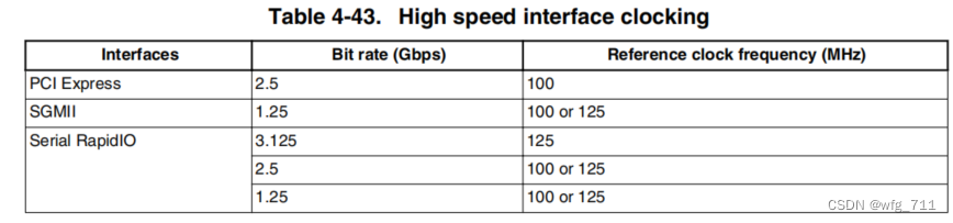 | 2、这些高速时钟来自于 SerDes 块中的一个PLL, 该PLL由一个参考时钟(SD_REF_CLK/SD_REF_CLK)驱动,它的输入频率是所使用的协议和比特率的函数,如本表所示