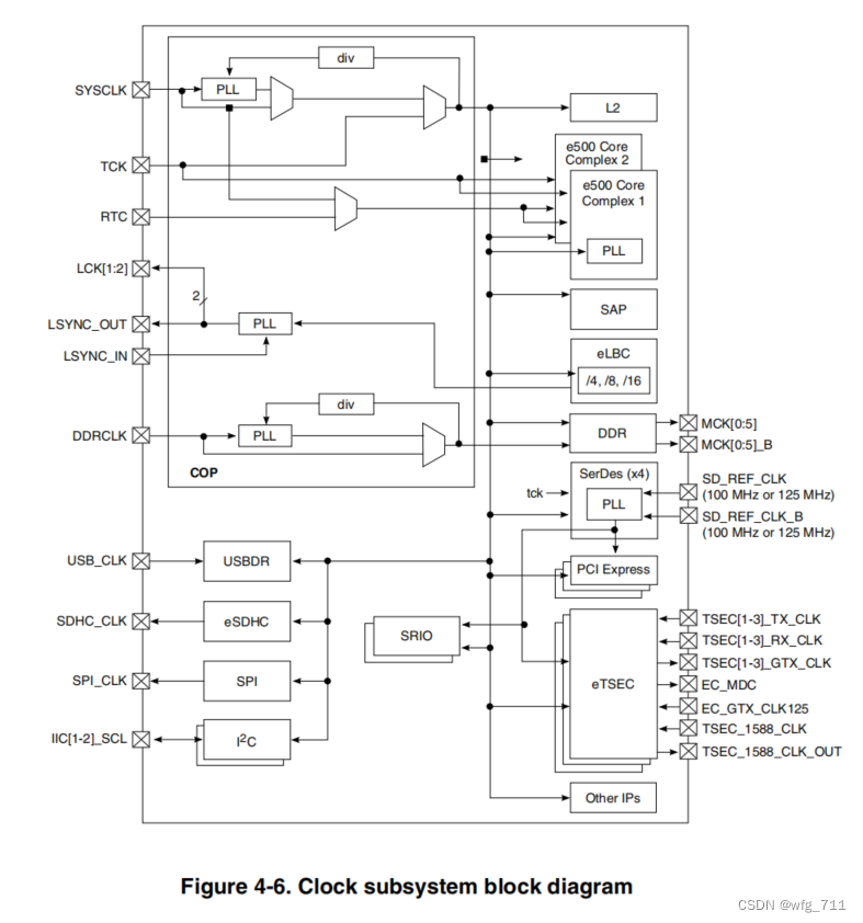 | 1、系统时钟和 DDR 控制器时钟 芯片需要一个输入时钟,作为 e500 core 和所有外设、接口与 core同步操作的首选时钟源。 SYSCLK输入 (频率) 使用锁相环(PLL)用于创建核心复合总线(CCB)时钟(也称为站台时钟) CCB 时钟被用于几乎所有的同步系统逻辑,包括L2高速缓存,以及其他内部块,如DMA和中断控制器。 CCB 时钟 还提供e500核中的pll和为本地总线内存控制器创建时钟的PLL。