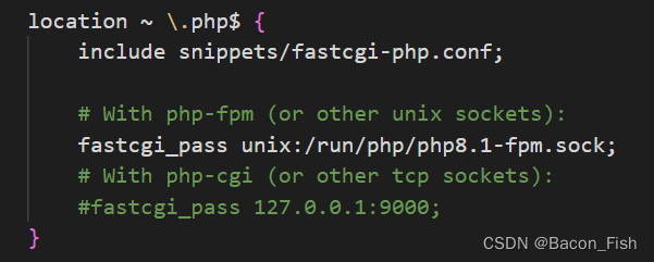 - 转到location ~ \.php$块,去除行前#号,选择With php-fpm方法,将路径中的PHP版本修改为对应安装版本。修改完的效果应如图所示: