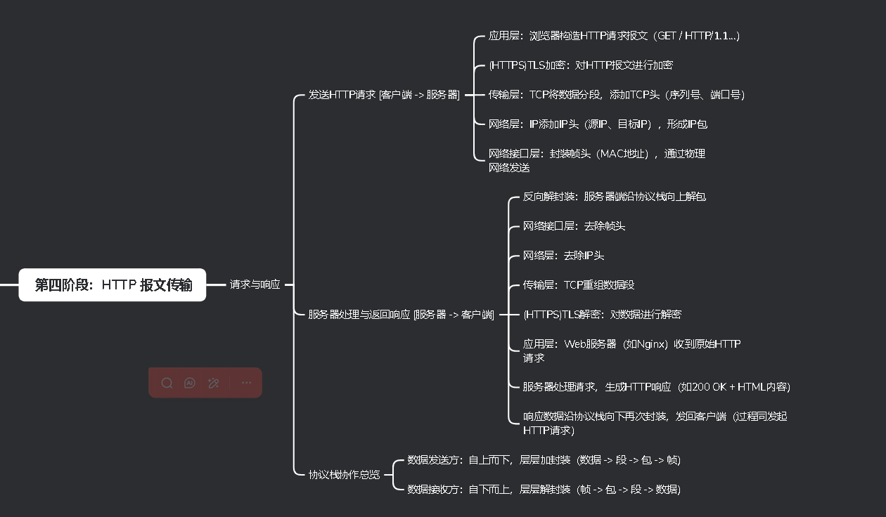 服务器沿协议栈向下封装HTTP回应报文,如:HTTP/1.1 200 OK后跟着HTML内容,过程与客户端发送请求完全对称。