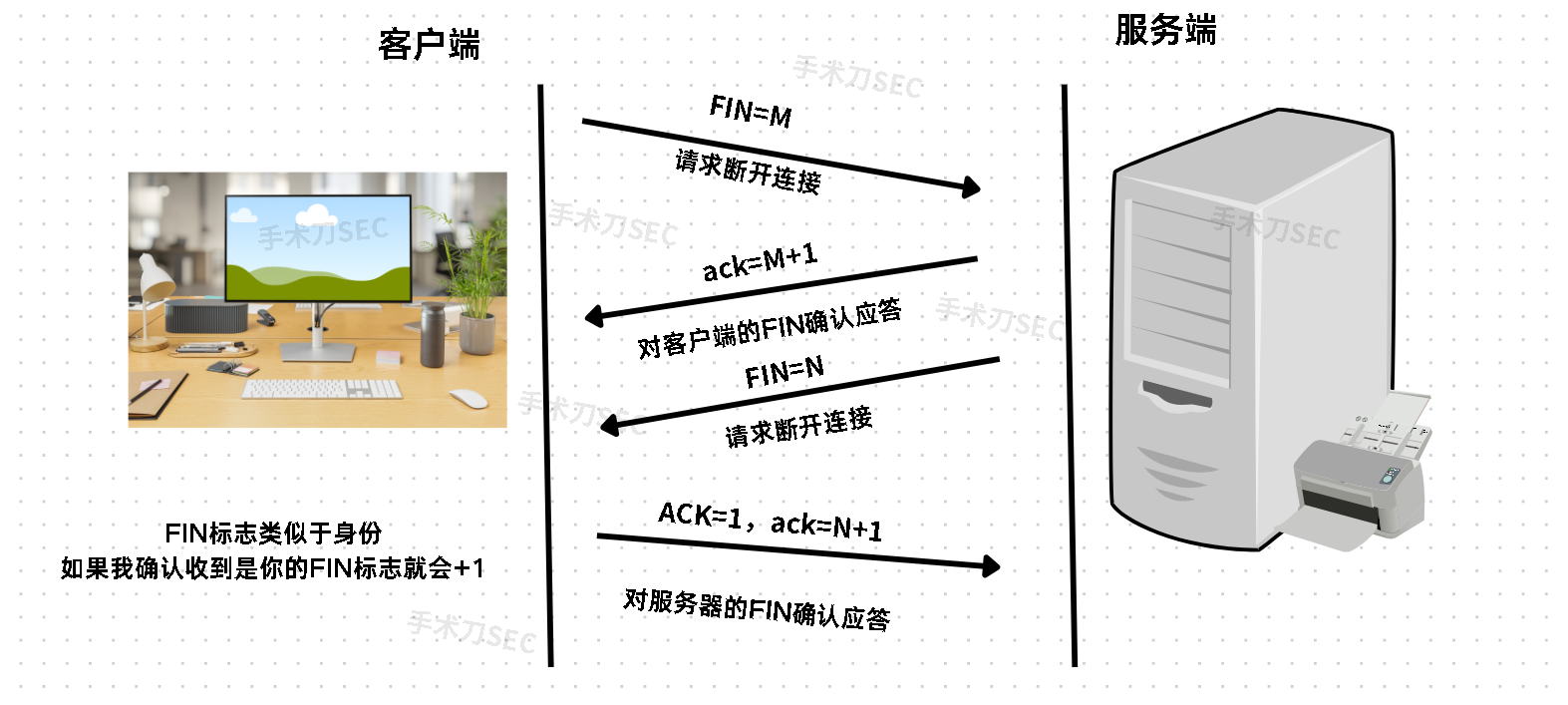 1.FIN(结束):主动关闭方(可能是客户端或服务端)发送一个TCP段,将FIN标志设为M.