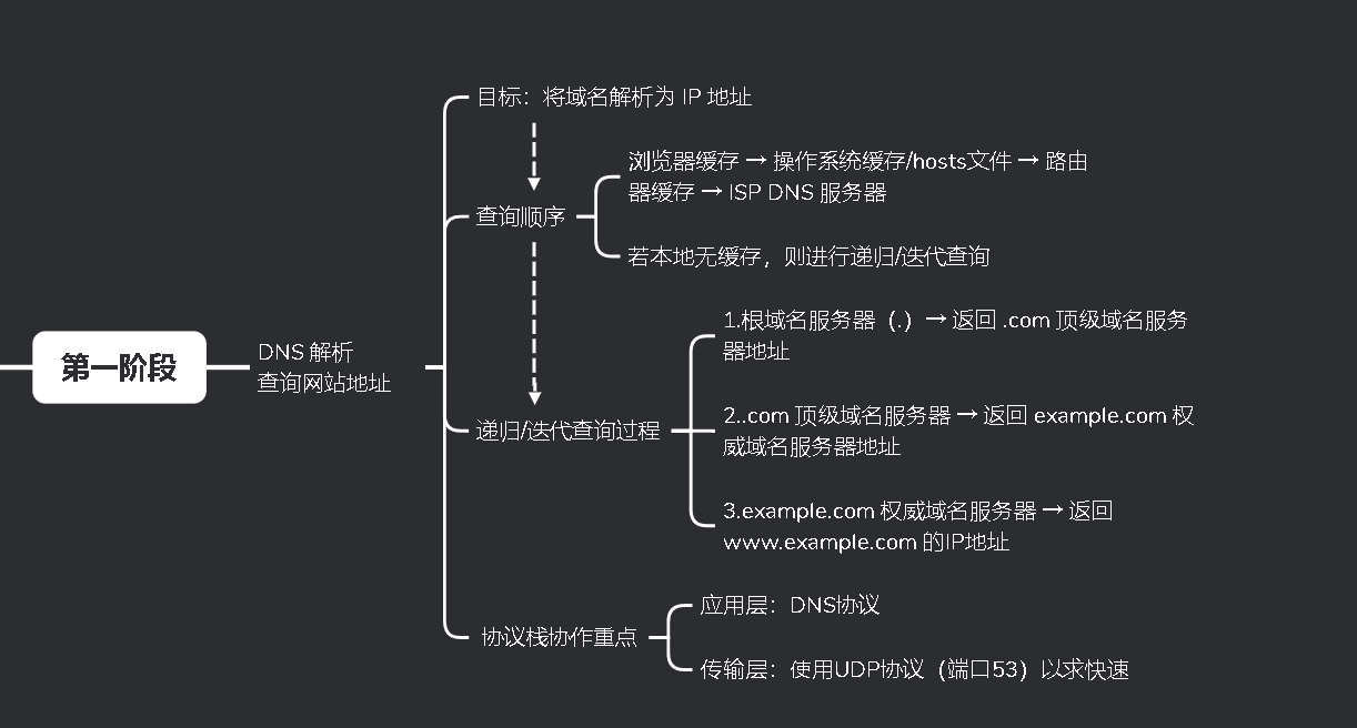 5.递归/迭代查询:ISP的DNS服务器会代表你的计算机,从根域名服务器、.com顶级域名服务器,一直查询到example.com的权威域名服务器,最终获得IP地址,并逐级返回给你的浏览器。