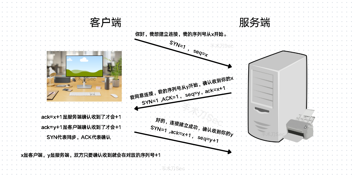 目的:服务器对客户端说:“我收到了你的请求,我同意连接(所以x+1),我的初始序列号是y(如果客户端收到确认并建立连接就y+1)”