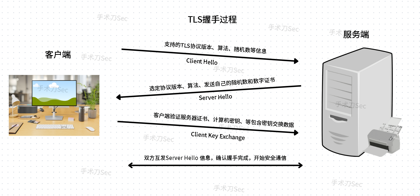 3.建立安全运输队(TLS握手):双方商量号,以后货物都放在特制的防拆解保险箱(对称加密)里运输,并交换了保险箱钥匙。