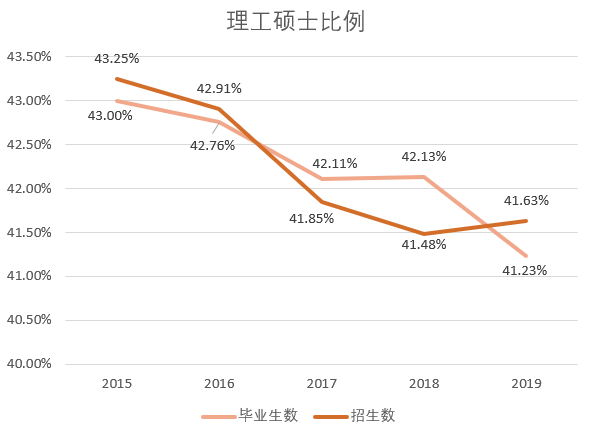 但研究生扩招的主体却不是理工科专业,在扩招背景下,理工硕士招生量占国内研究生招生总量不断下降,从2015年的43.25%降至2019年的41.63%,而本科毕业生人数却屡创新高。