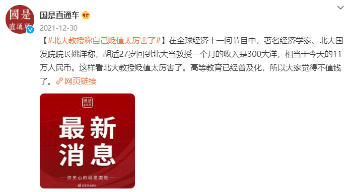 与此同时,热榜上还挂着【北大教授称“月入5千已经是高收入了,属于前14%的水平”】【北大教授称“高等教育普及化,大家都觉得不值钱了”】等消息,成功搞垮了不少人的心态: