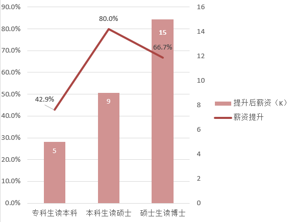 也就是说,读上硕士对于毕业生薪资提升最明显的,甚至接近专升本的2倍。