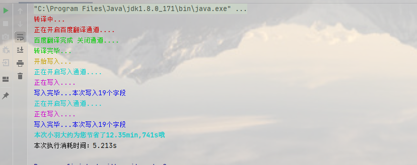 System.out.println(getFormatLogString("百度翻译完成 关闭通道....", 32, 5));