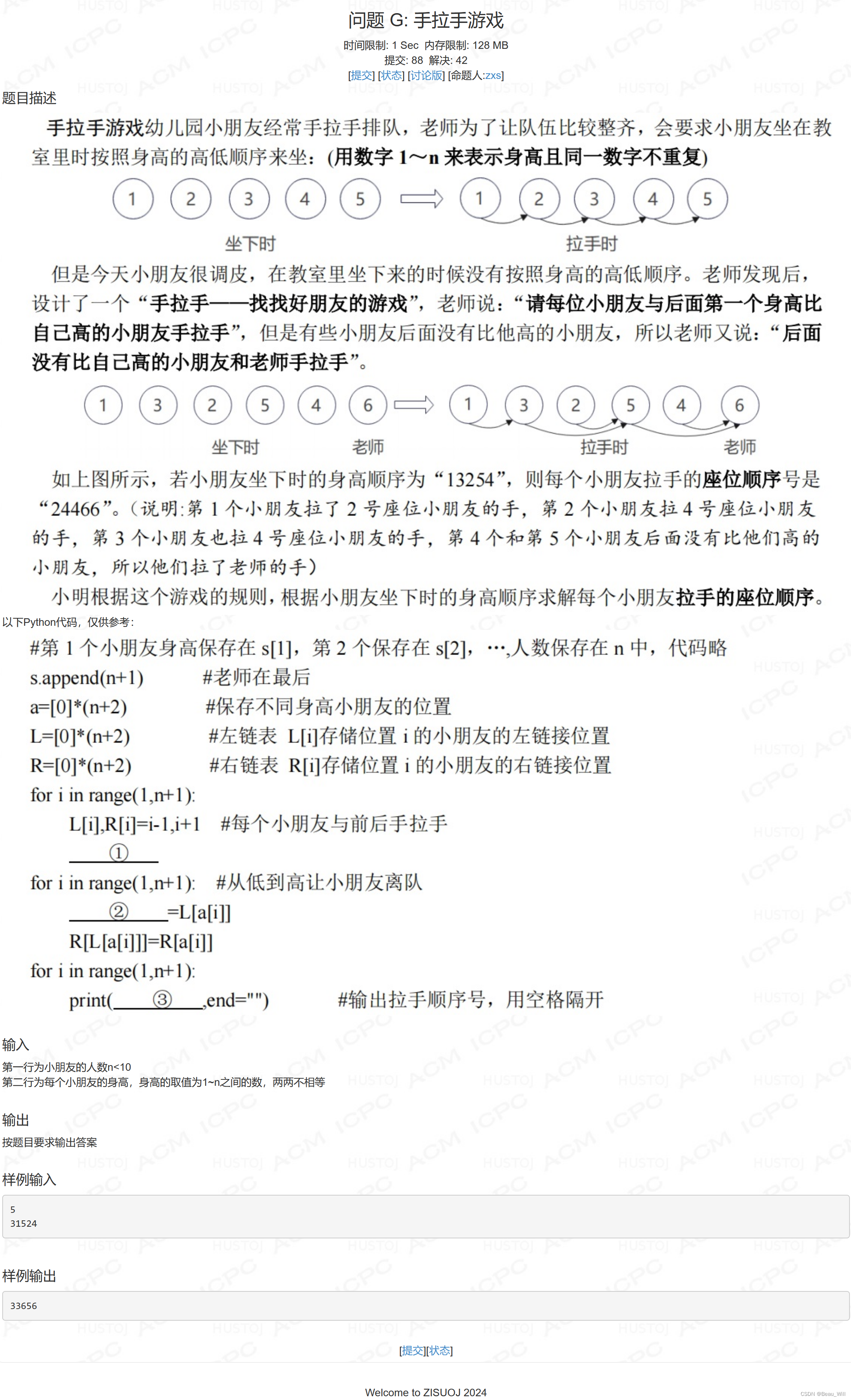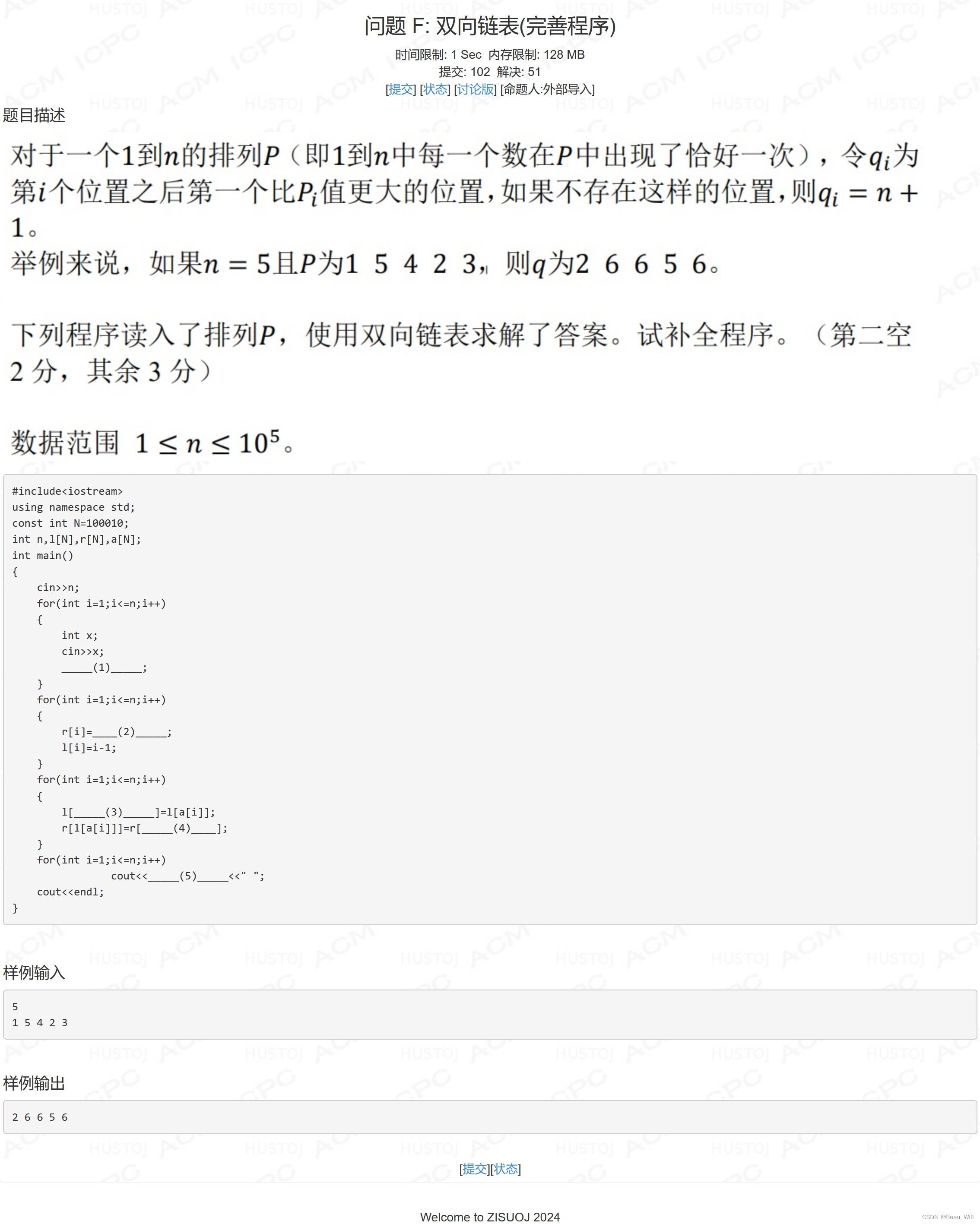 数组模拟双链表的填空题,想明白最后题目要我们输出的右侧第一个大于它的数,我们可以让每个结点的后继指向第一个大于它的数(若没有,则指向n+1)。