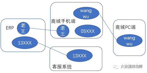 而现在,由于我们的系统越来越复杂,对客户的价值发现要求越来越高,我们在普通的场景中也有类似的需求。比如我们的交易平台上的用户交易信息和 ERP 中有可能只是通过订单关联,两遍的系统中的用户根本就是两码事,另外,我们 CRM 中的客户信息又是独立的。交易平台、 ERP 、 CRM 中的用户根本都是相互独立的,我们没法掌握与客户接触的全貌,也就没法精准的识别客户的价值。