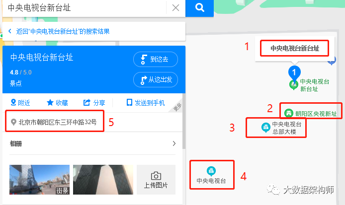 在 10 多年前的时候,当时IT界都还在做“四库十二金”的项目。我就接了这么一个活,就是把一个地区的所有地址给弄干净。这可就费劲了,因为同一个地址有 N 多种写法,比如说“大裤衩”,全称叫“中央电视台总部大楼”,门牌号是“北京市朝阳区东三环中路32号”,也有别称叫“中央电视台新址”,而且还有具体经纬度。