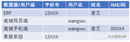 ID Mapping 有几个场景:1、多端数据的识别;2、多源数据的打通。这两种情况的处理方式基本是一样的。先举一个例子:老王在商城PC端浏览商品,在手机端下单,后台自动生成订单,交给ERP进行后续的订单、物流处理。后来老王有点不耐烦,给供应链金融客服打电话咨询。那么老王的数据如下: