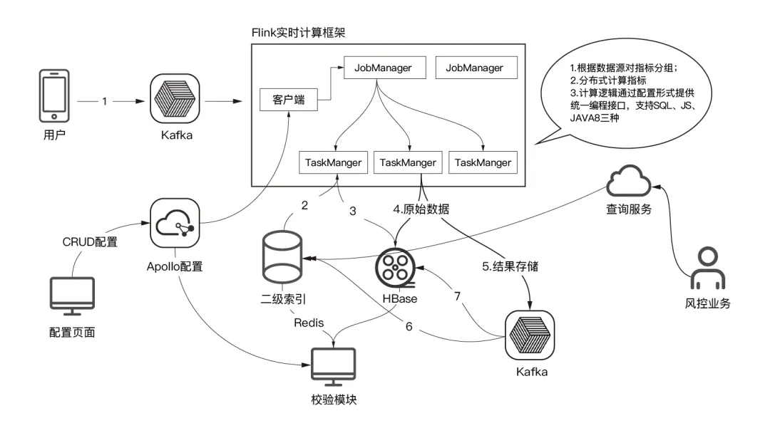 线上信贷的基本流程是:由用户通过 App 发起需求,App 会要求用户填写与授权相关的信息,主要目的是评估用户的信用额度。之后用户数据会进入后台数据系统进行反欺诈和信用的评估,审核通过,用户会收到信息,账户额度开通。基于 Flink 的超大规模在线实时反欺诈系统架构如下: