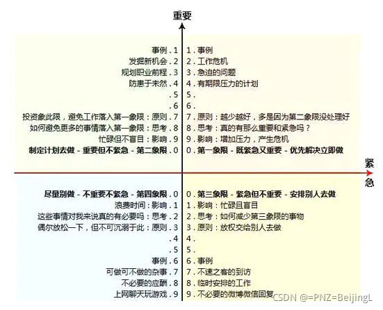 时间管理中有一个概念叫“时间四象限法则”,“时间四象限”法则是美国的管理学家科维提出的一个时间管理的理论,这个理论的观点是把工作分成四种类型并放入平面四个象限中