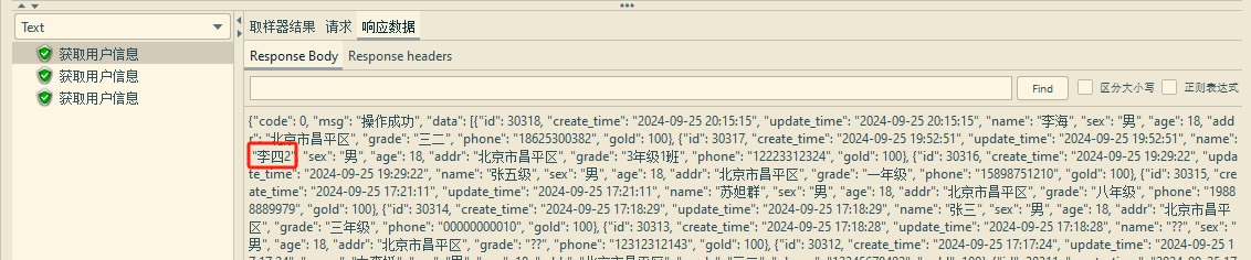 上面是提取了token值拿来用了并没有输出,如果我们想要内容中的比如说名字,我们也可以用边界提取器
