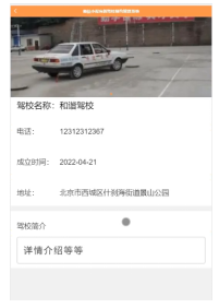 驾校信息,在驾校信息页面可以查看图片、驾校名称、电话、成立时间、地址、驾校简介等信息,如图5-3所示。