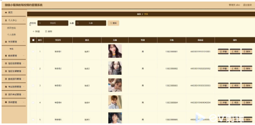 学员管理,在学员管理页面可以对索引、学员号、姓名、头像、性别、手机、身份证等内容进行详情、修改或删除等操作,如图5-11所示。