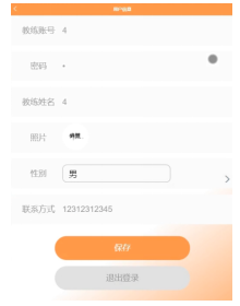 教练信息,在教练用户信息页面通过填写教练账号、密码、教练姓名、照片、性别、联系方式等详细信息进行保存或退出登录操作,如图5-6所示。