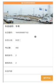 考试信息,在考试信息页面可以图片、科目名称、科目编号、科目分类、考试费、教练账号、教练姓名、科目内容等信息,并进行预约考试操作;如图5-4所示。