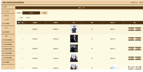 教练管理,在教练管理页面可以对索引、教练账号、教练姓名、照片、性别、联系方式等内容进行修改或删除等操作,如图5-12所示。