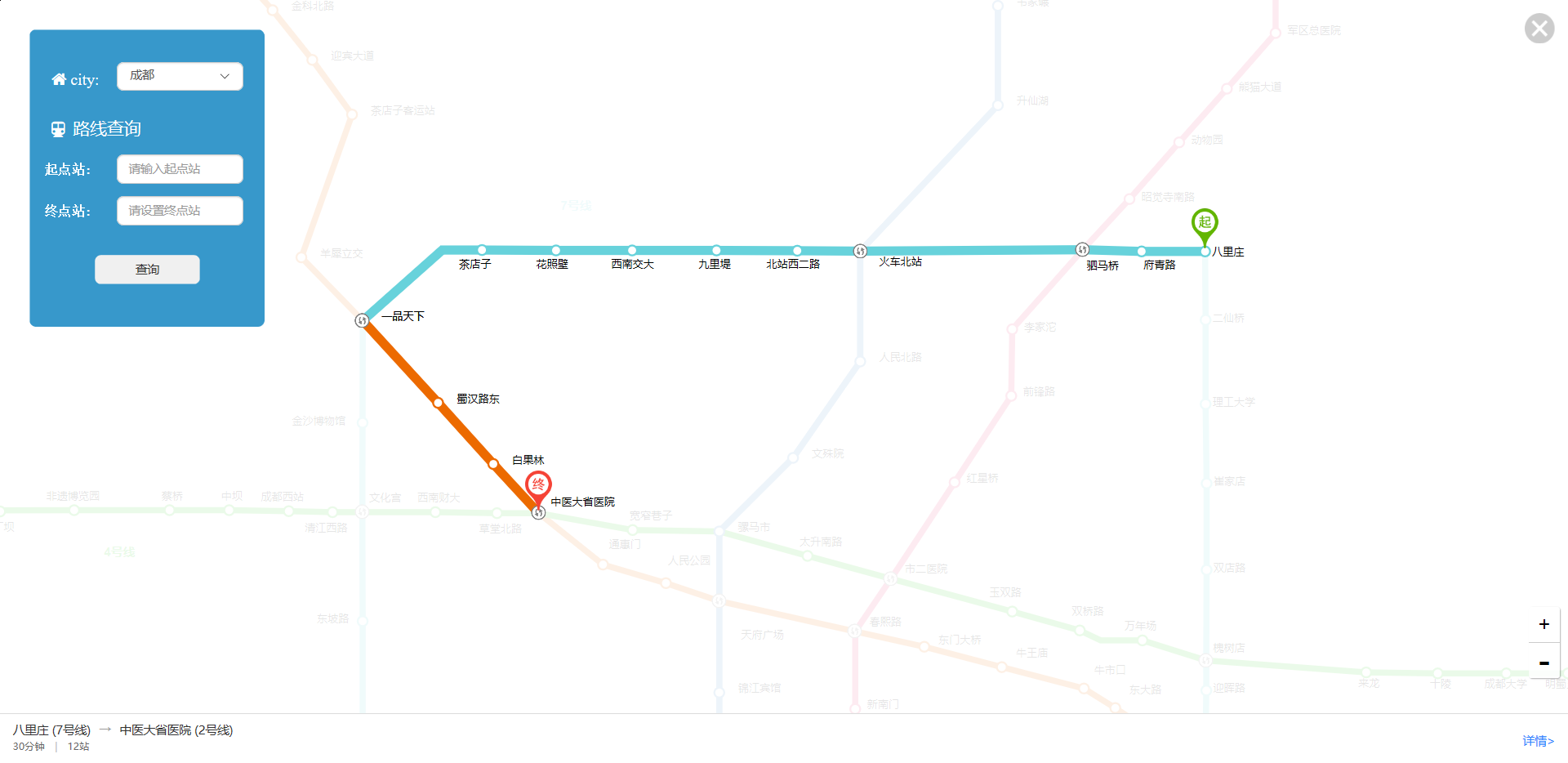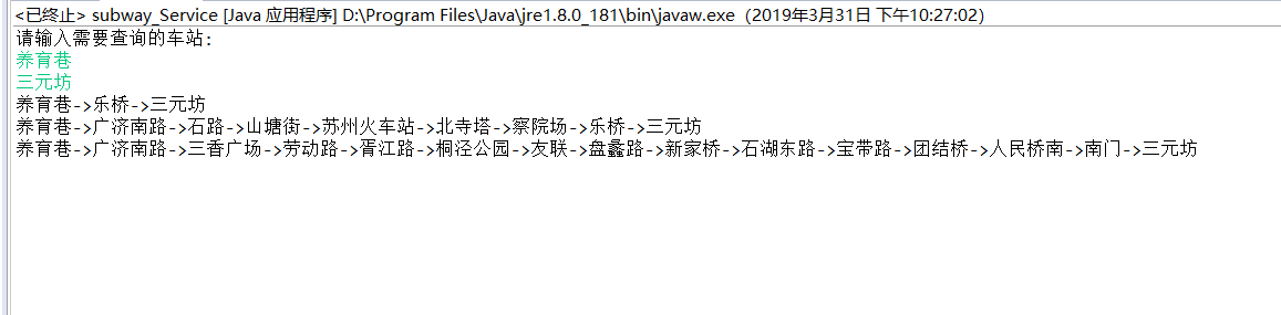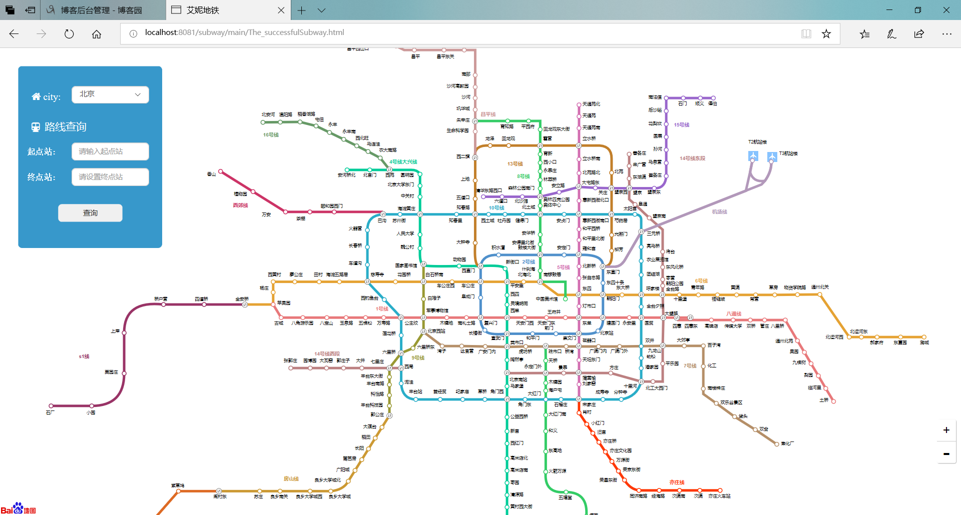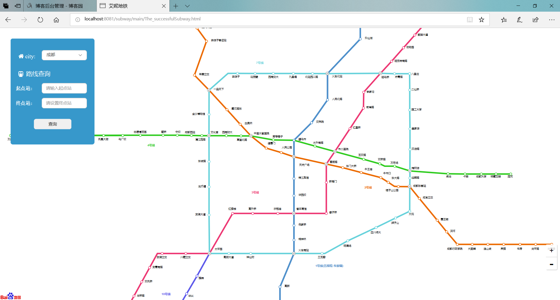 用时大概时间 18 个小时 我的队友是 :黄珺瑜我们一开始的想法是自己建立数据库,用来查询路线,再调用一下百度api作为地图(仅作地图没有任何操作的那种);后来我们的步骤也的确是这样,我们先确定了苏州地铁图为项目对象,然后将它所有的地铁站,线路等信息储存到数据库里,通过建立5个数据表来储存,四个表为线路表,还有一个表是交换站表。并按部就班的设计我们的算法。终于经过我们历时6个小时左右的时间终于把我们的算法设计出来了。 以下是一条线上没有交换站的情况,有交换站的情况,以及两条线的情况: