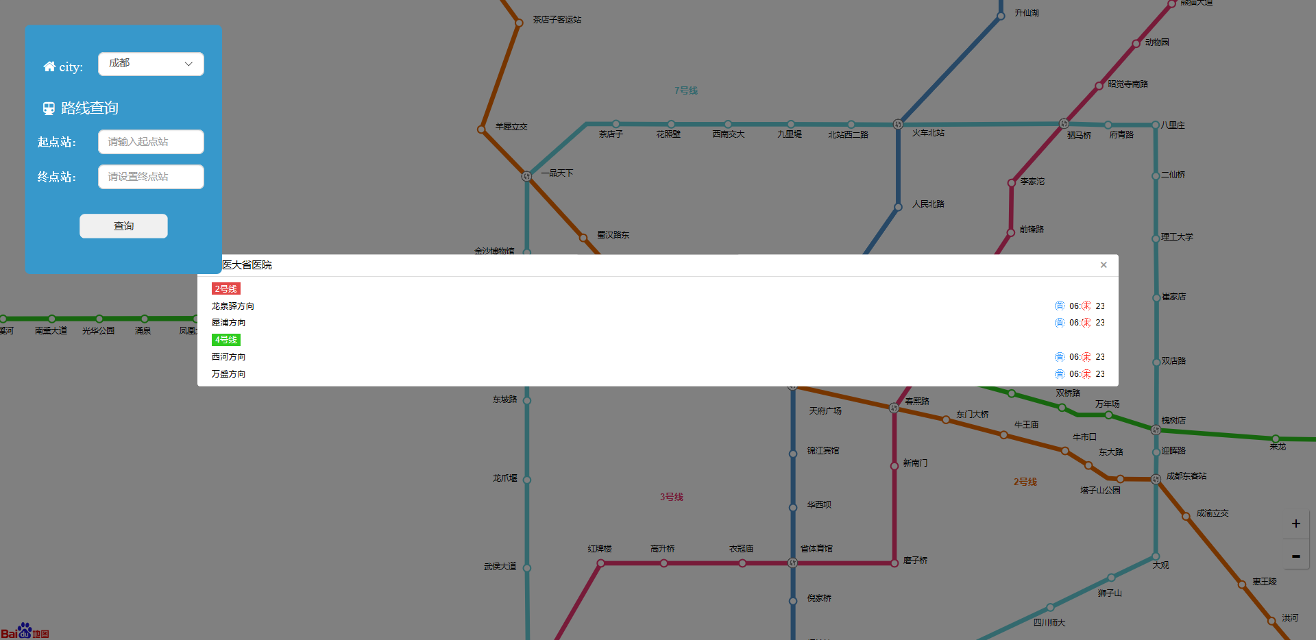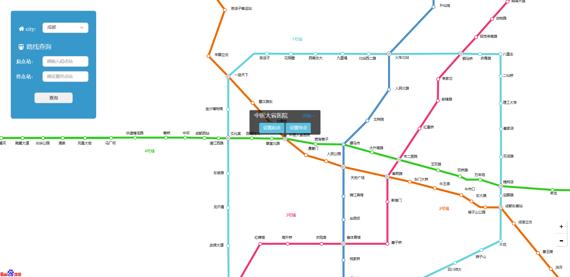 然而等我们打算连接百度地图api的时候我们发现生活给我们开了一个超大的玩笑,再我们试着去了解百度地图api连接的时候,我们发现我们费时将近八个小时弄出来的苏州地铁路线算法部分一点用武之地都没有!!!我们开始学习百度api通过它的百度地铁文档以及一些实列懂得一些静态的站点信息显示,指定起点终点查看路线,创建地铁图等。然后我们试着将它转化为动态的,可以让用户去选择。具体如下图所示这是一个主页面,它可以选择城市地铁图,设置起点,终点,查看站点详情。查询相应的路线有两种;一种是通过点击站点设计,另一种是通过输入站点来查询;