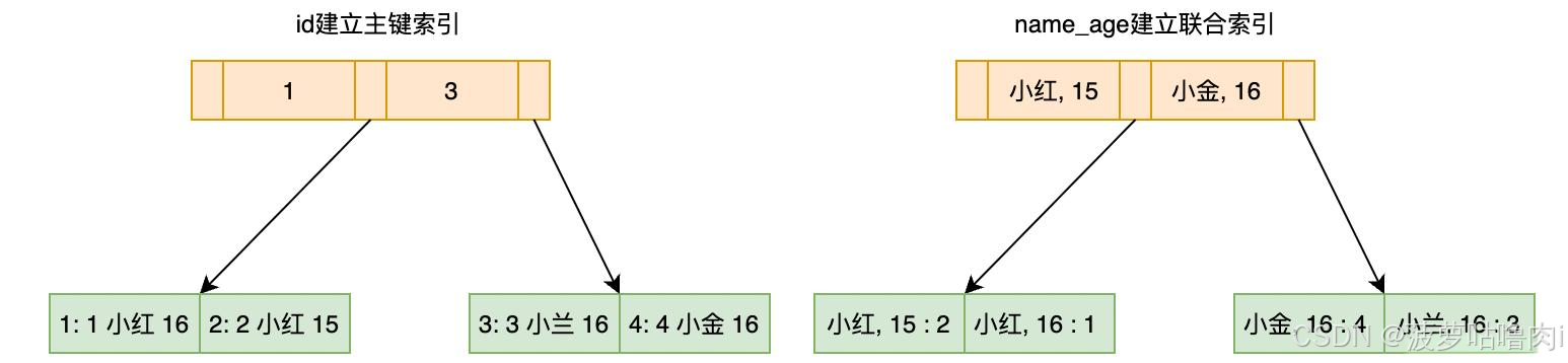 # 先按照右侧age建立的辅助索引树找到age=15对应记录主键id值等于1,然后再去左侧主键索引搜索树搜索id=1的这条记录
