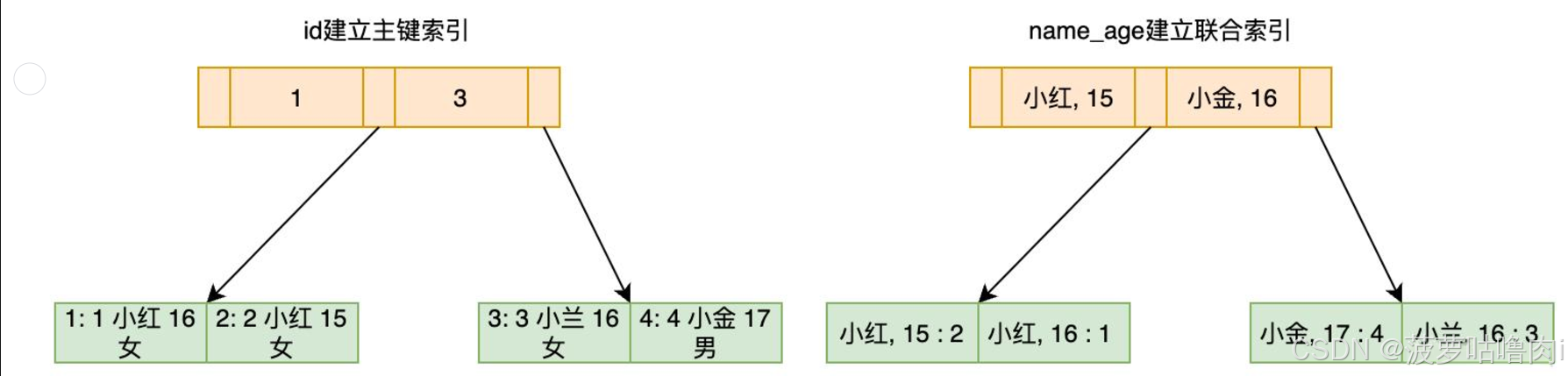 辅助索引可以在多个字段之间建立,如果第一个字段相同则比较第二个字段,依次类推建立索引搜索树结点之间的先后关系,也就是说索引项按照索引定义的字段顺序排序 (后面要讲到的最左前缀原则就是在此基础上来分析的) ,下面举个例子,还是借助上面这张表,但是辅助索引不是单单age字段建立,而是name和age共同建立。
