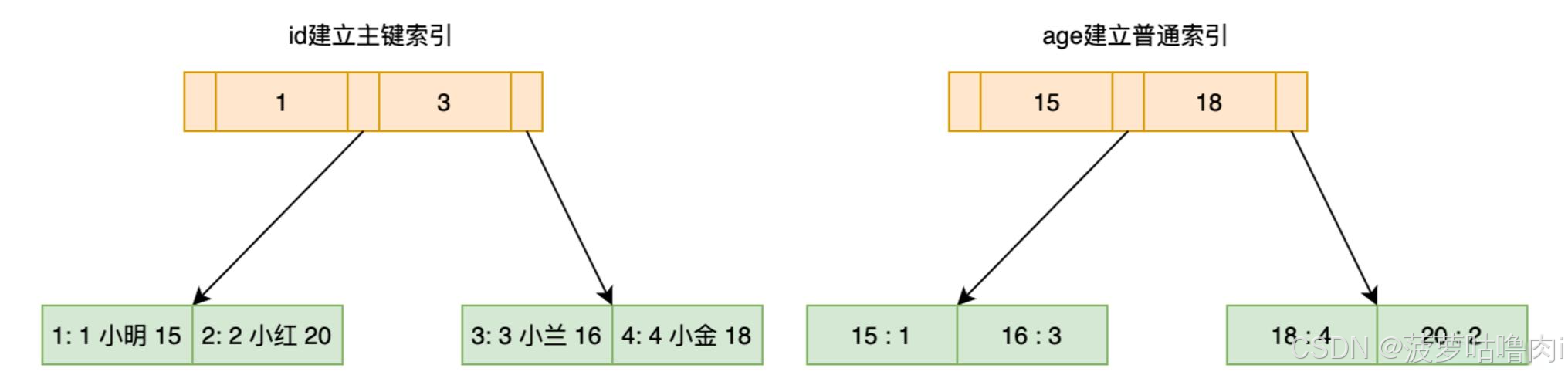 这里给出一张表,id字段为主键索引,age字段为普通索引,然后插入一些数据,然后给出InnoDB为其维护的两个逻辑上的索引文件结构。