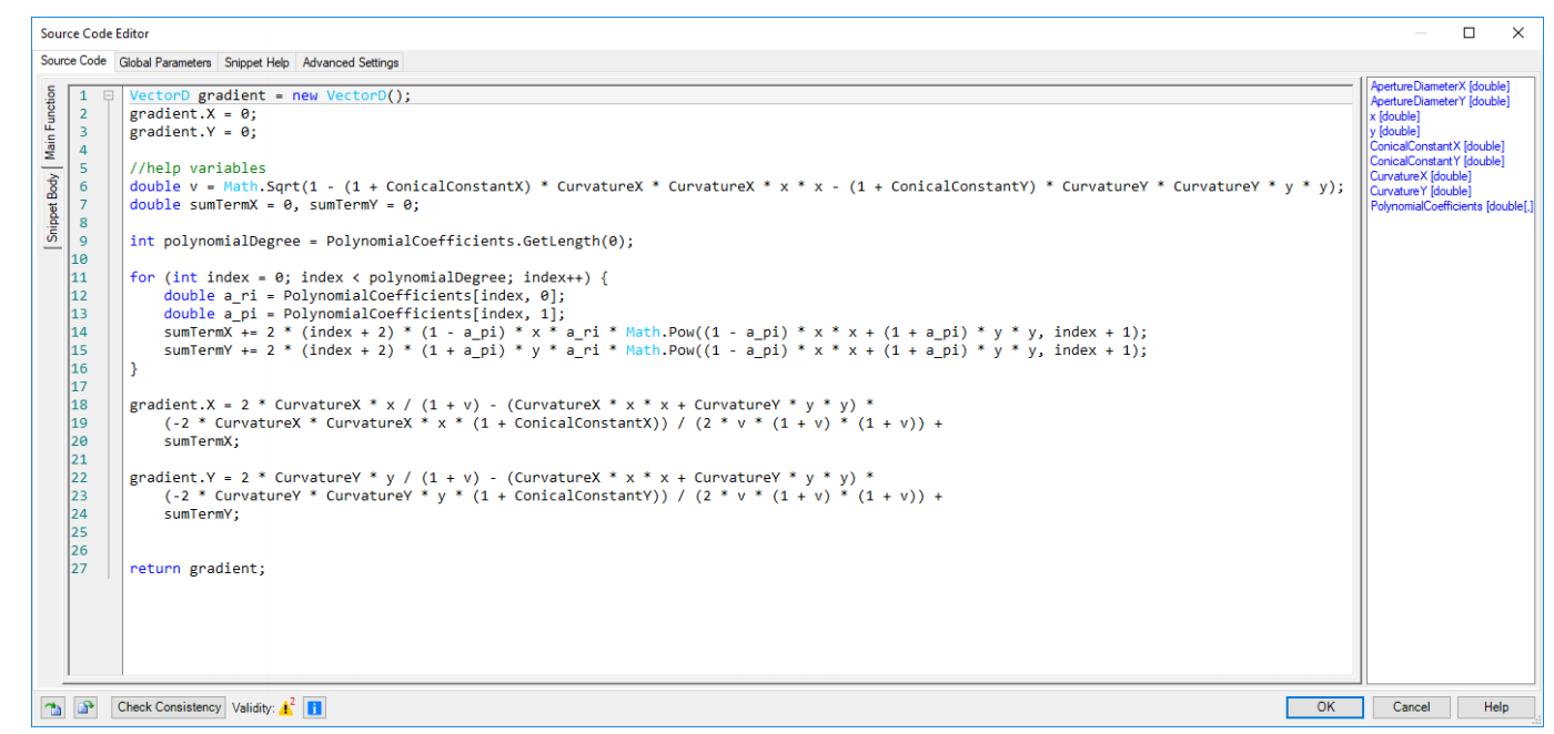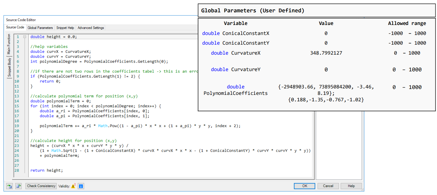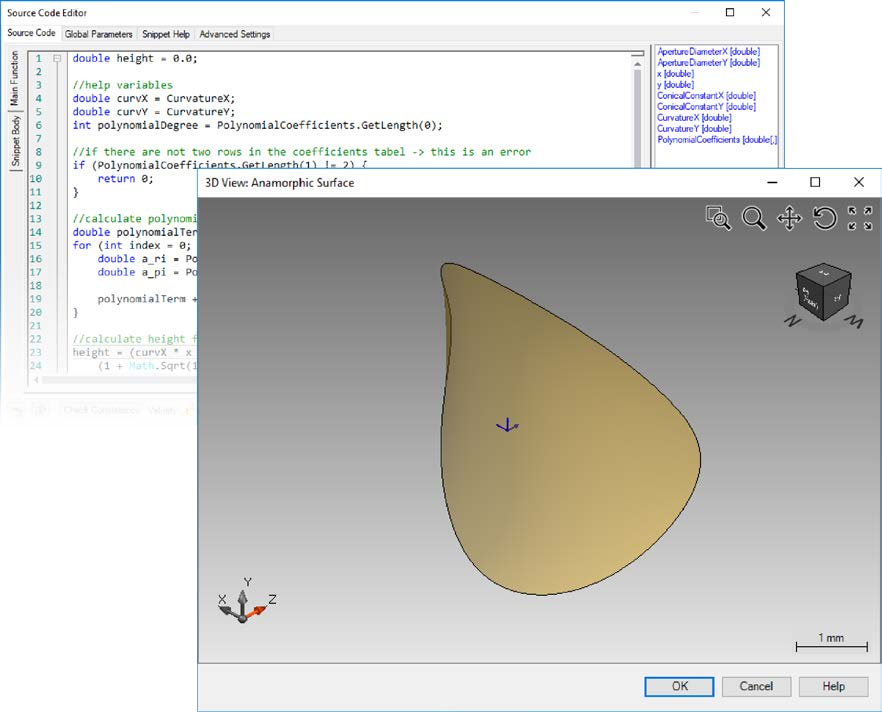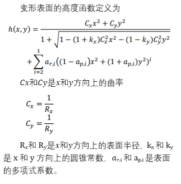 VirtualLab Fusion中的可编程界面可自定义自由曲面。 本示例说明了如何将变形表面定义为高度函数,同时演示了如何解析得出曲面梯度。表面规格参数,例如圆锥常数,曲率和多项式系数值,都可以在VirtualLab Fusion中自定义。