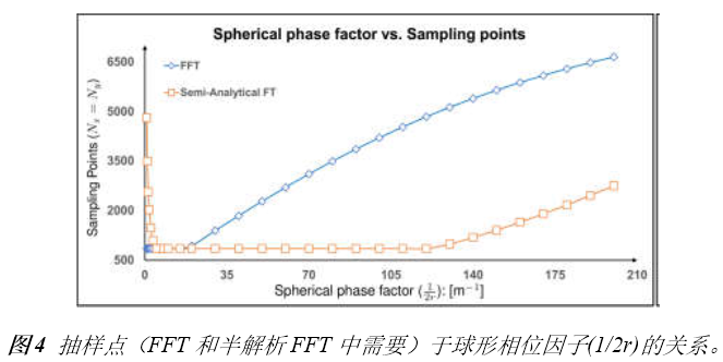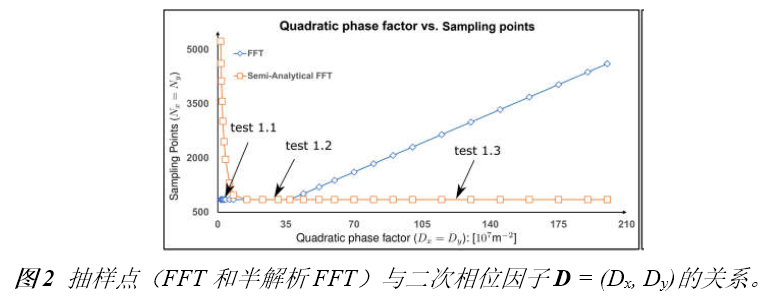 图2展示了不同情况下FFT和半解析FFT所需的采样点。可以发现当场有强二次相位时,半解析FFT需要比FFT少得多的抽样点。