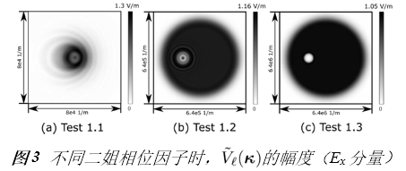 在图3中我们给出了三个典型位置的角频谱的振幅。解释了波阵面相位的物理意义,因此当波阵面相位非常小时,在FT中衍射效应占主导地位。否则,当波阵面相位增加时,FT展现了越来越多的几何特征。