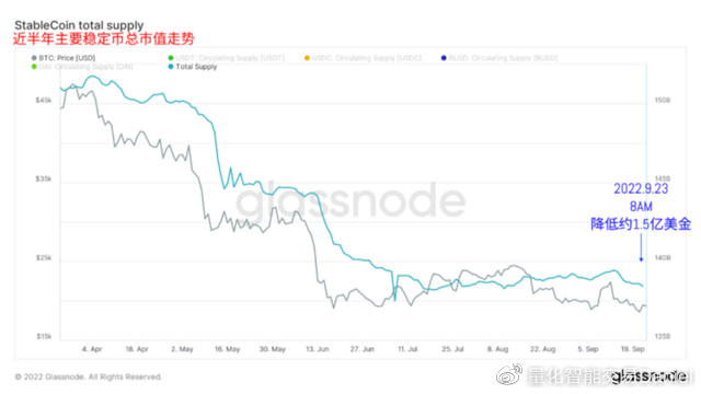 对于币市数据来说,最重要的依然是资金的情况,尤其是外部资金的进入以及场内资金的减持。从数据上来看,经历了加息导致的宏观情绪变化后,虽然USDT再次出现了市值扩大的迹象,但还是被USDC的市值跌破500亿美金抵消了,而BUSD的市值水平移动也显示了主力稳定币市值持续减弱的迹象,场内资金在持续流失。