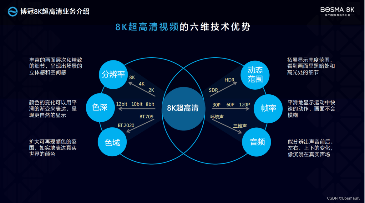 5G是当前网络传输速度的代表,而8K超高清视频是符合高帧率、高位深、广色域、高动态范围等技术要求的新一代视频,具有更精细的图像细节、更强的信息承载能力和更广泛的应用范围,意味着16倍超越传统1080P时代的视频内容,象征着内容板块的深度演变。