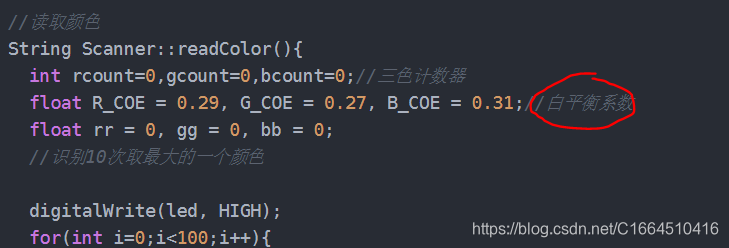 (为了降低环境对颜色传感器的影响,在颜色识别的库函数中有一组白平衡系数要提前检测输入进去)