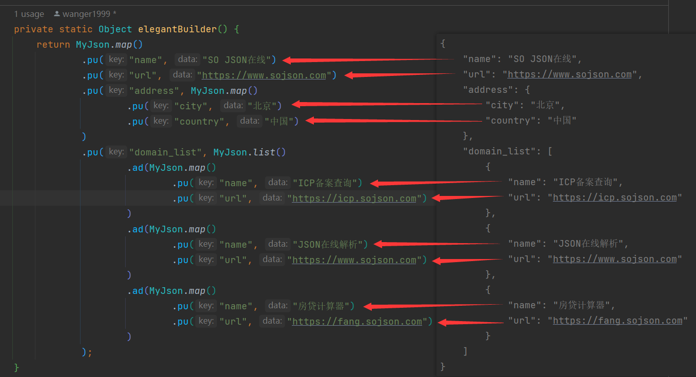 后端json快速构造工具,json直观构造工具,java优雅构造json数据 自定义MyMap/*** @Description: 自定义map,实现简化json构造*/自定义MyList/*** @Description: 自定义list,实现简化json构造*/静态创建map与list/*** @Description: 创建自定义list或者map*//*** 静态创建自定义list实例* @return 实例对象*//*** 静态创建自定义map实例* @return 实例对象*/