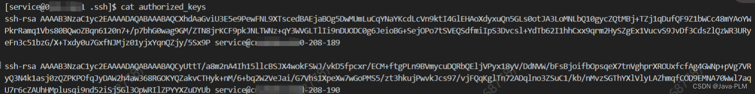 vim authorized_keys ,将server1生成的/home/service/.ssh/id_rsa.pub的内容复制到authorized_keys