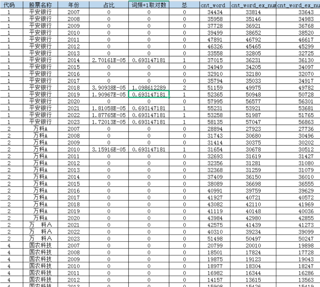 01、数据简介本数据依据C刊《科学学研究》中彭家乐(2024)老师的研究方法,我们对沪深A股上市公司的年报进行了深入的文本分析。为了量化企业受技术封锁影响的程度,我们采用了年报文本中技术封锁相关关键词的总词频占比作为指标。具体步骤如下:关键词确定、数据获取与处理、文本分词与存储、词频统计与指标计算。数据名称:上市公司-企业技术封锁数据数据年份:2007-2023年参考文献:彭家乐,谢伟,李习保 技术封锁与并购-基于文本分析的实证研究02、相关数据代码 股票名称 年份 占比 词频+1取对数 总 cnt_word cnt_word_ex_num cnt_word_ex_num_eng cnt_word cnt_word_ex_num cnt_word_ex_num_eng 总 补充词频 贸易保护主义 抬头 非关税壁垒 贸易壁垒 贸易摩擦 磨擦 禁运 特保 国际制裁 经济制裁 出口管制 反倾销 外汇管制 核危机 禁令 公约 强制性 制裁 法令 保护主义 报告对应会计期间截止日期 文本数据源类型 文本数据源类型 该词汇在全文查找中的词频03、