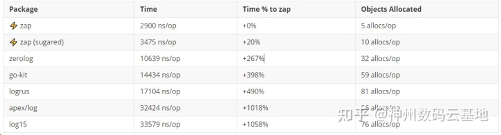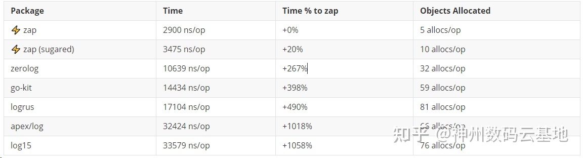 其中 setupLog 方法所做最重要的事就是使用 zap 替换全局 logger。在继续跟踪源码之前,首先解释一下为什么要做替换日志组件的操作。go 原生日志包秉承 go 简洁设计的思想,实现简单,但是功能较为简陋。在性能上并没有突出表现。相比于原生日志包,zap 最突出的表现就是高性能。下表就是 zap 与其他日志包性能对比的情况。TiDB 作为底层分布式基础设施,要尽可能将性能用在数据服务上。对于日志记录,则需要使用性能损耗小,功能支持多的日志组件。