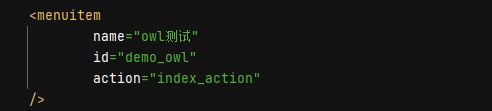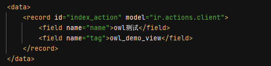这里的 name=“tag”标签中的owl_demo_view,是需要和core.action_registry.add('owl_demo_view', test_owl);这个名字是一样的,odoo才能获取到对应的页面,然后你点击菜单的时候就会渲染