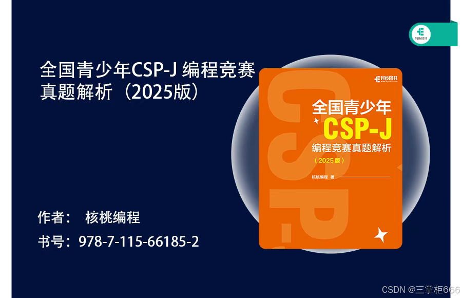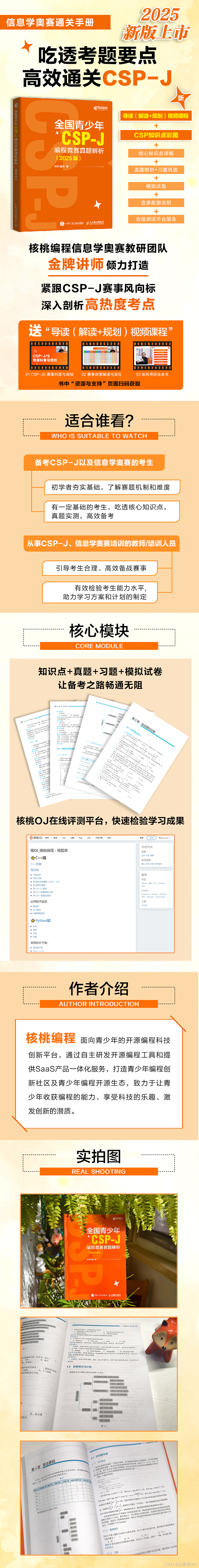 接下来给大家推荐一本关于编程竞赛的优质书籍,《全国青少年 CSP-J 编程竞赛真题解析(2025 版)》。这是一本专为 CSP-J 竞赛编写的真题解析书籍,内容详实、解析透彻,本书涵盖了 2025 年 CSP-J 竞赛的全部真题,从基础题型到高难度挑战,逐题深入解析,提升解题能力!另外,关注本文博主,点赞 + 收藏本文,且在本文评论区评论“入手 CSP-J 真题解析”,将选取三名幸运读者送出纸质版《全国青少年 CSP-J 编程竞赛真题解析(2025 版)》一本,截止时间:2025.07.12。入手《全国青少年 CSP-J 编程竞赛真题解析(2025 版)》传送门:https://item.jd.com/14941068.html 或者 《全国青少年CSP-J 编程竞赛真题解析(2025版)》(核桃编程)【简介_书评_在线阅读】 - 当当图书。个人觉得这本书非常不错,是一本不可多得的竞赛辅导书,值得每位参赛者拥有并深入学习。