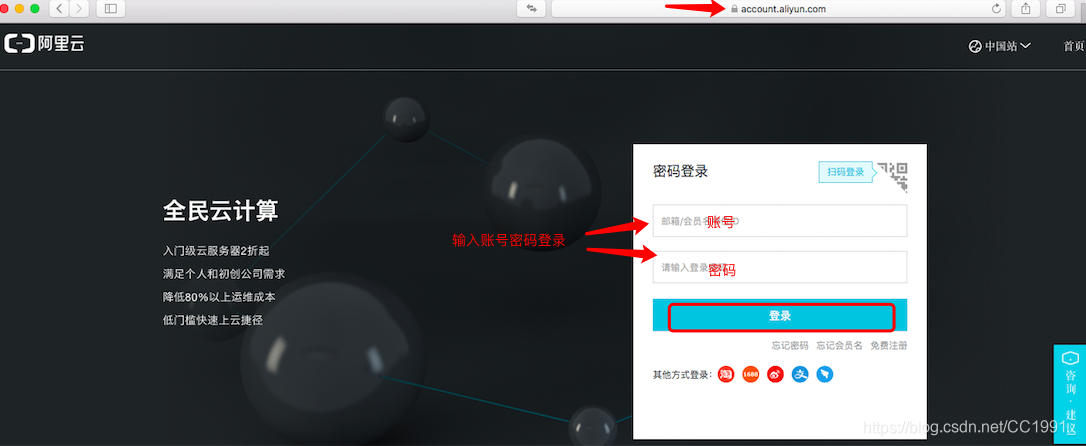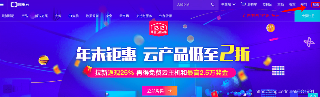 一、登录云ECS控制台,点击右上角“登录”,输入账号密码进行登录。