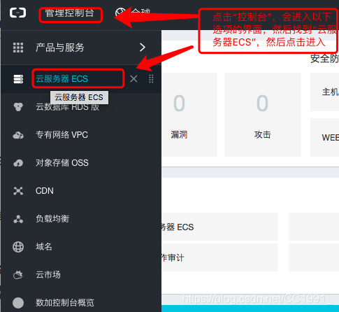 三、进入控制台之后点击选择左侧“云服务器ECS”选项